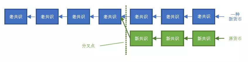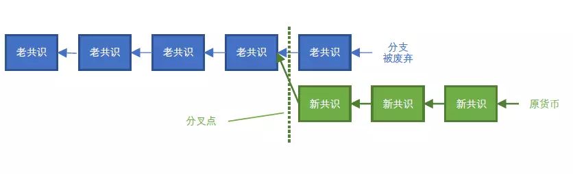 - 第一种结果:一大批节点都不支持新的共识规则,继续使用以前老的共识(通常是老客户端)运作,这时候也有一定数量的节点开始使用新的共识规则(通常是新客户端)。那这个时候,两边不同的共识都会拒绝对方共识产生的区块,使得他们分裂成为两种不同的区块链(加密货币)。